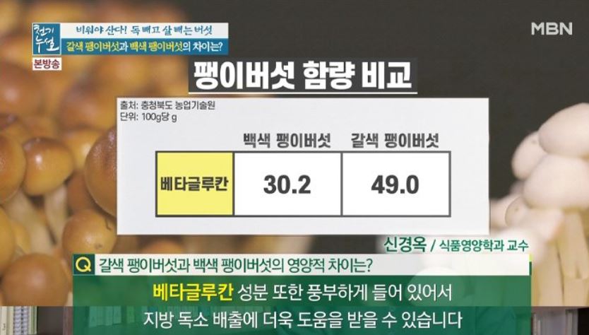 갈색 팽이버섯은 백색 팽이버섯보다 지방 함량이 2배 이상 적고 단백질의 함량은 높아서 내장지방 분해를 돕는 대사가 잘 이뤄지게 합니다.