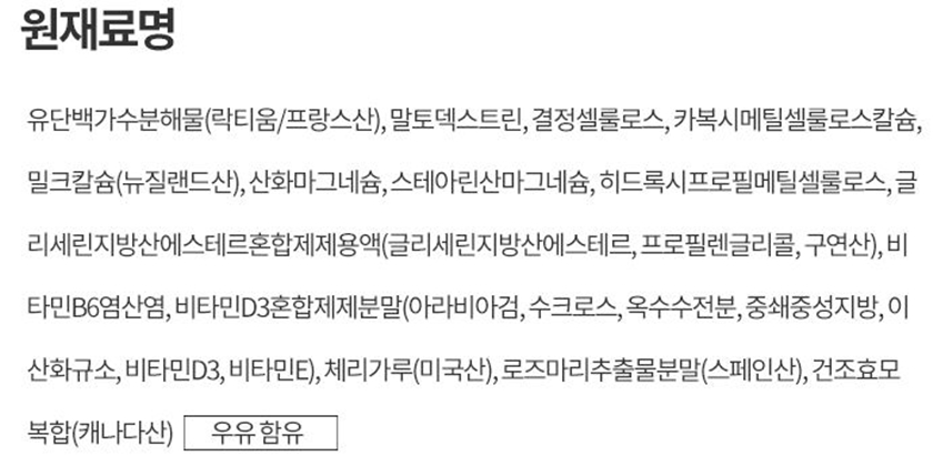 락티움과 함께 사용된 부원료로는 밀크칼슘, 체리가루, 비타민B6염산염, 비타민D3혼합제제, 로즈마리 추출물분말 등 다양한 성분이 함유되어 있습니다.