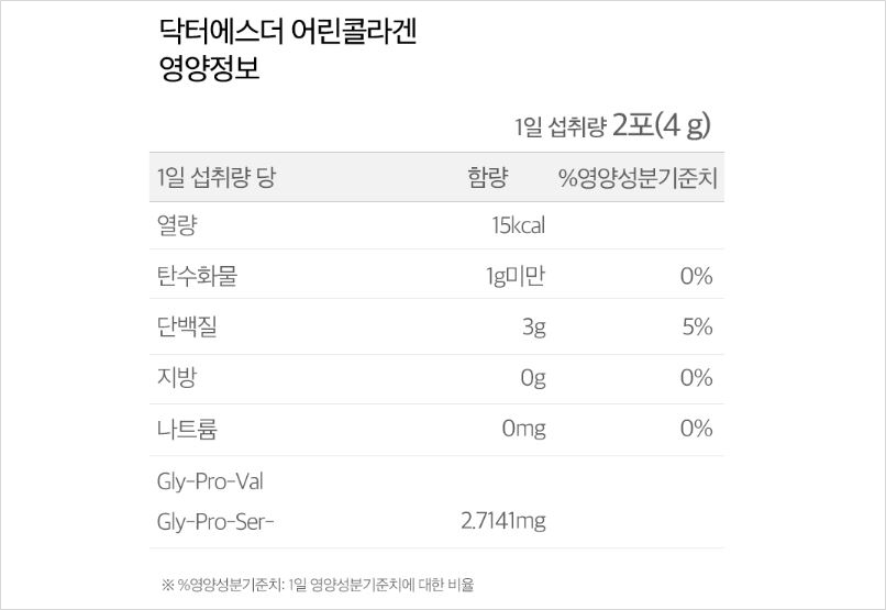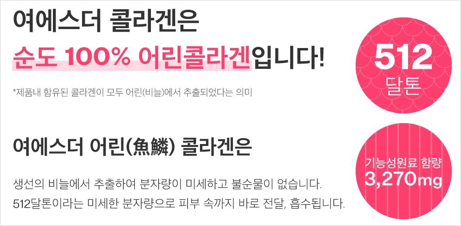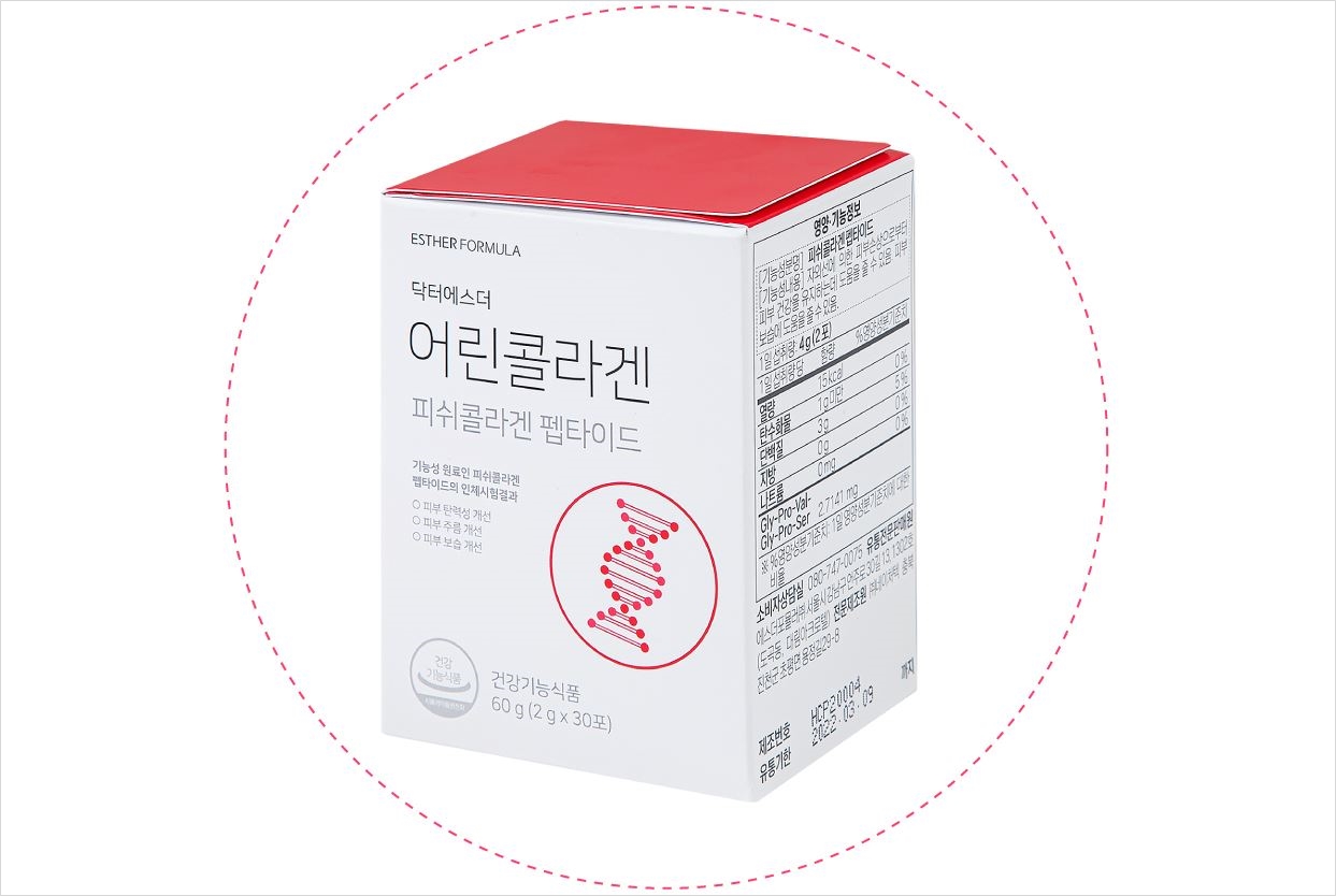 여에스더 박사는 유명한것 알고 있으시죠? 여에스더 박사가 직접 설계한 성분배합비로 피쉬콜라겐펩타이드를 주원료로 히알루론산과 엘라스틴을 함유하였습니다. 피쉬콜라겐펩타이드는 피부보습,피부탄력,피부주름,피부거칠기 개선의 4가지 결과가 확인된 기능성 원료이기 때문에 피부 건강을 유지하는데 도움을 줄 수 있다고 합니다.