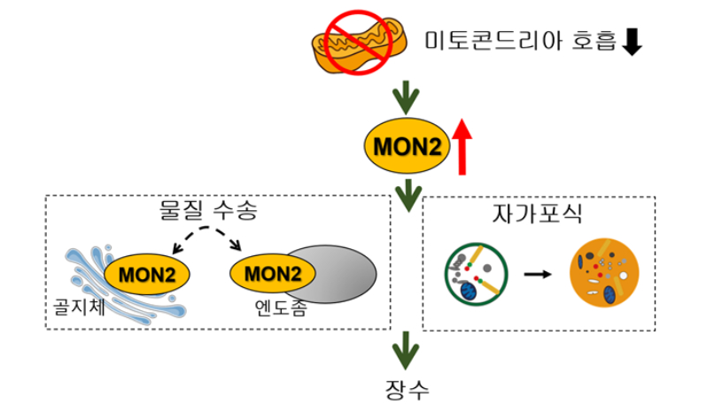 연구팀은 단백체학 기술을 활용하여 미토콘드리아 호흡이 저하되어 수명이 길어진 돌연변이 예쁜꼬마선충에서 정상 선충과 달리 특이적으로 많이 생성되거나 적게 생성되는 단백질(골지체 단백질 MON2 포함 1000여종)을 발굴했습니다.