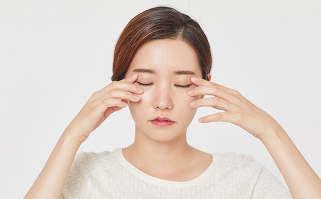 ③ 좌우 대각선 방향으로 5회 정도 움직인 다음 손바닥을 비벼 눈 위를 지그시 눌러줍니다.