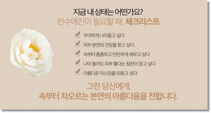 내가 천수애진을 꼭 먹어야할까라고 생각하시는분들이 있을거에요, 피부는 하루라도 젊을때 미리 관리해야한다는것 알고 있으시죠?
